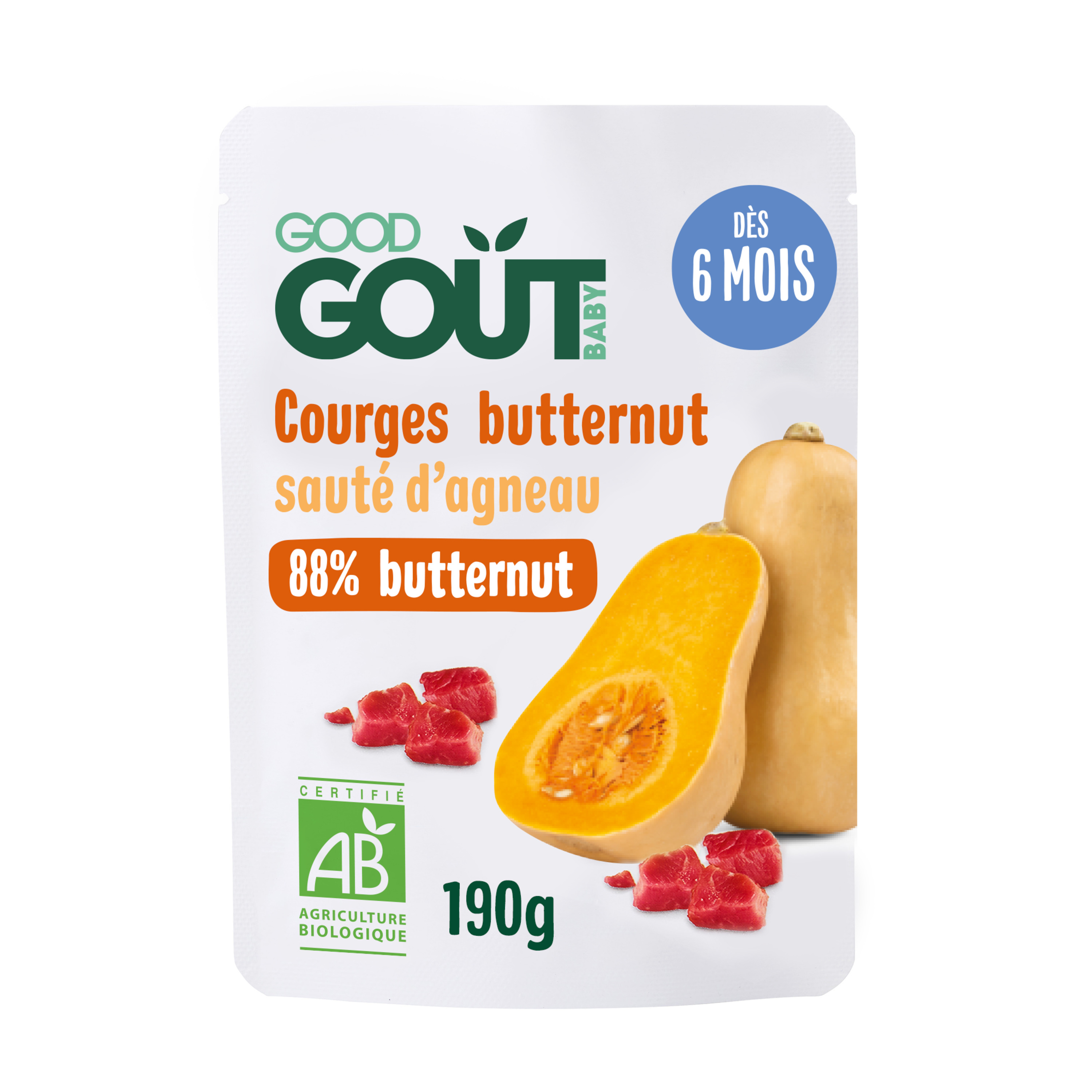 80% courges butternut bio, eau de cuisson, 8% viande d'agneau bio, 2% carottes bio, 2% oignons bio. , céleri