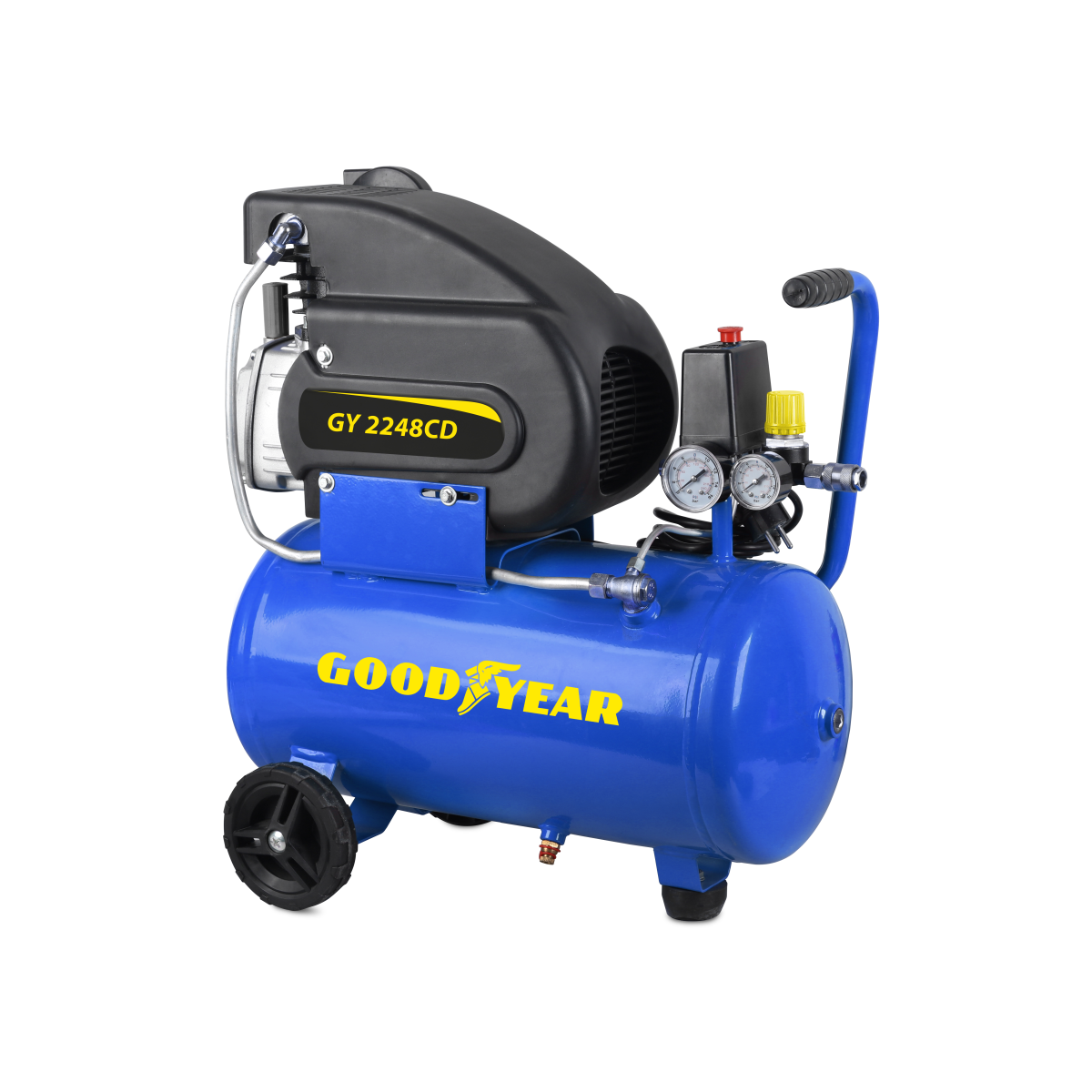 Très efficace et nécessitant peu d'entretien : le compresseur à air électrique Goodyear intègre un moteur de pompe à pression en aluminium de 2 CV de puissance, avec un réservoir de 24 litres.
