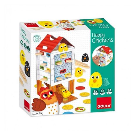 Un jeu compétitif avec deux modes de jeu. Dans le premier mode de jeu, l'enfant doit retirer le bâtonnet en bois qui a la même couleur que les jetons en carton et essayer d'obtenir le plus de poussins possible pour remporter la partie. Dans le second mode de jeu, il suffit de retirer le plus de bâtonnets possible avant que les poussins ne sortent.