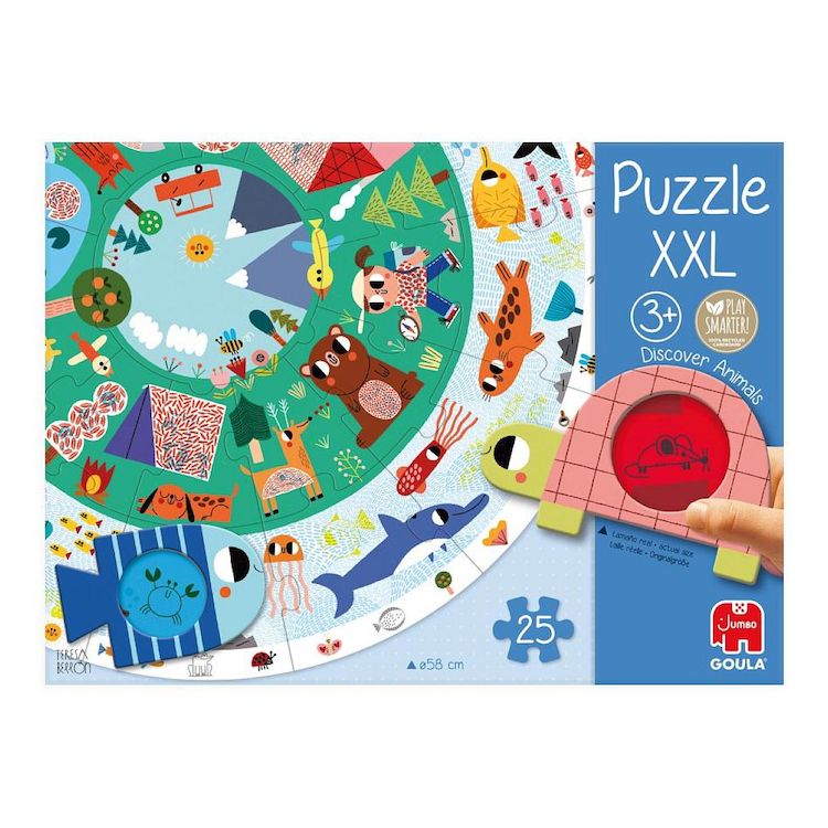Un puzzle en carton de 25 pièces contenant des éléments cachés? Grâce aux lentilles de couleurs l'enfant peut les retrouver !. Un puzzle et un cherche et trouve pour partir à la découverte des animaux.