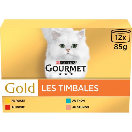GOURMET™ GOLD Les Timbales, de délicieuses et fines bouchées d'émincés au bœuf, au poulet, au saumon ou autres succulentes saveurs, délicatement assaisonnées avec un soupçon de sauce. Une combinaison présentée en exquise timbale pour que votre chat puisse en savourer chaque bouchée.