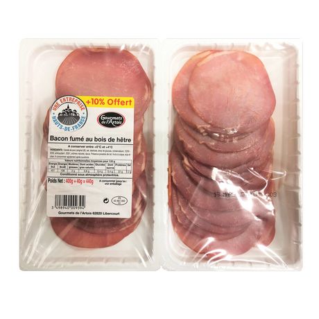 Délicieuses tranches de bacon délicatement fumées au bois de hêtre pour accompagner tous vos plats, omelettes, à déguster froid ou chaud.