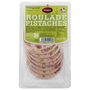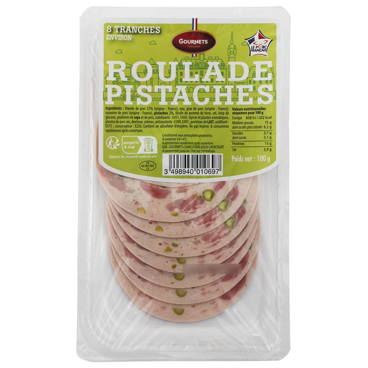 Roulade jambon en tranches avec de beaux morceaux de jambon et de la PISTACHE, fabriquée en France avec de la Viande Française, pour vos plateaux charcuterie, vos sandwichs, avec une raclette, ou tout simplement à déguster par envie.