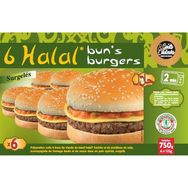 Préparation cuite de viande de bœuf halal* hachée et de protéines de soja, accompagnée de fromage fondu et de sauce dans un petit pain spécial, surgelé