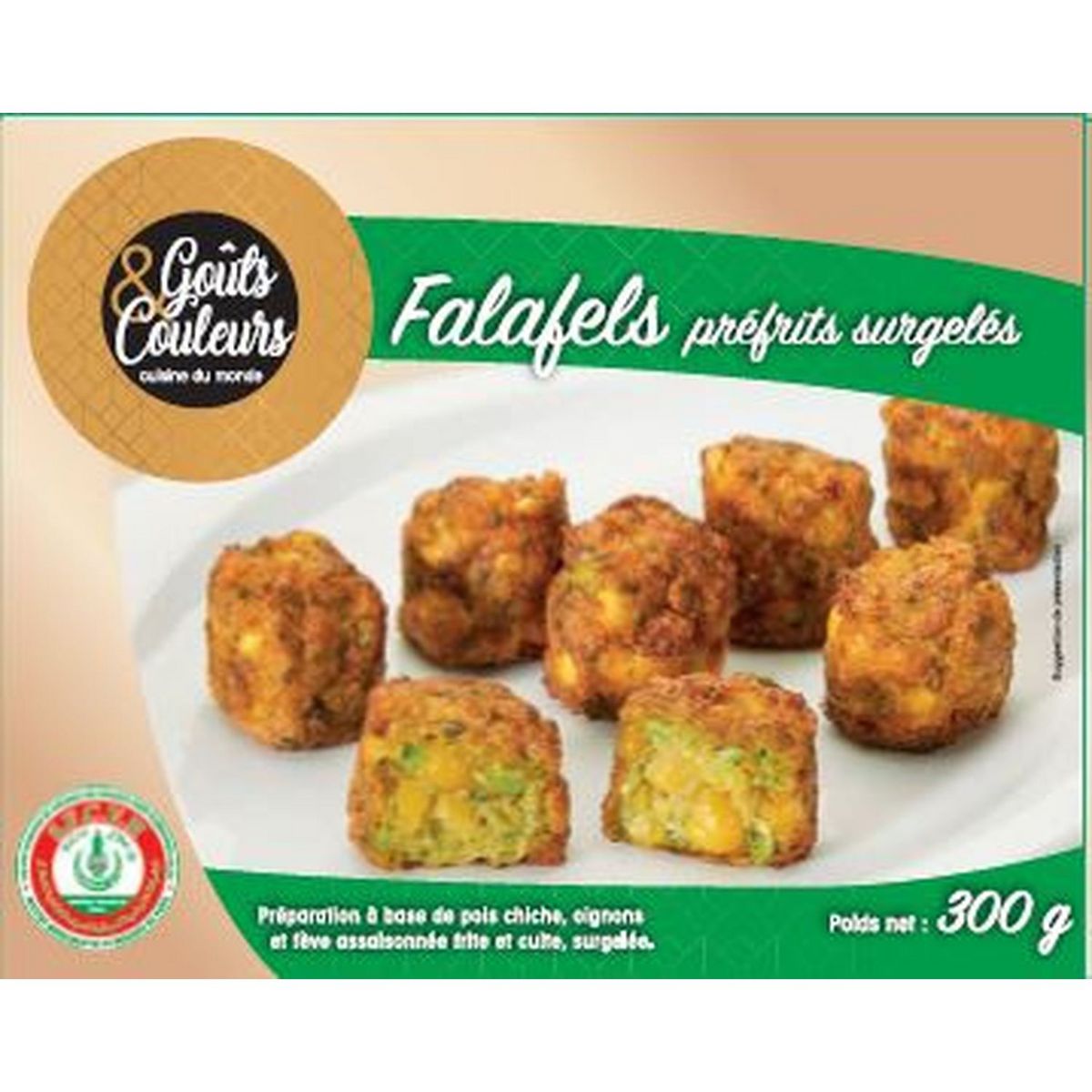 Ingrédients : Pois chiche (31,8%), oignons (25,5%), ŒUF, fève (12,7%), assaisonnement pour falafel (7%) (Amidon transformé, chapelure de pois, bicarbonate de sodium, sel, plantes aromatiques, épices, arôme naturel, ail déshydraté, fibre de plantain), CREME, fibre de bambou. Huile de friture : huile de colza.