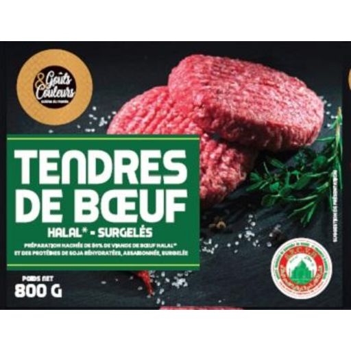 Préparation hachée de 80% viande de bœuf halal et des protéines de soja réhydratées, assaisonnée, surgelée