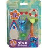 Contient 1 figurine 5 cm Disney Stitch, 1 planche de surf, 1 palmier et des accesoires.
