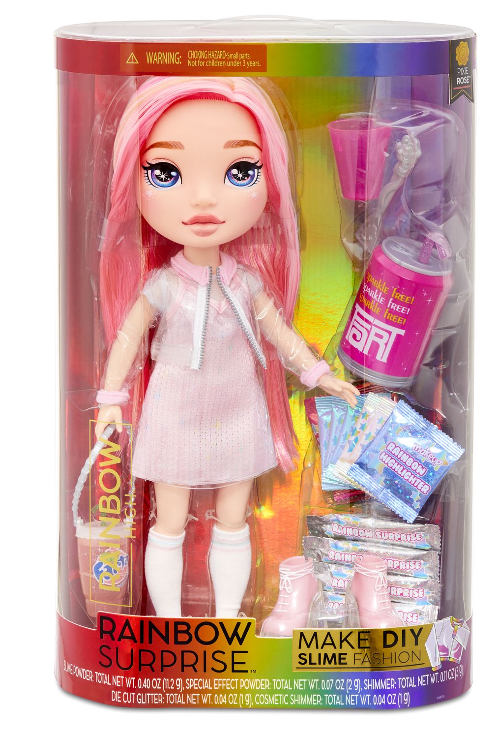 - 1 grande poupée Rainbow Surprise de 40 cm en tenue complète et tous les ingrédients pour fabriquer du slime pailleté :
