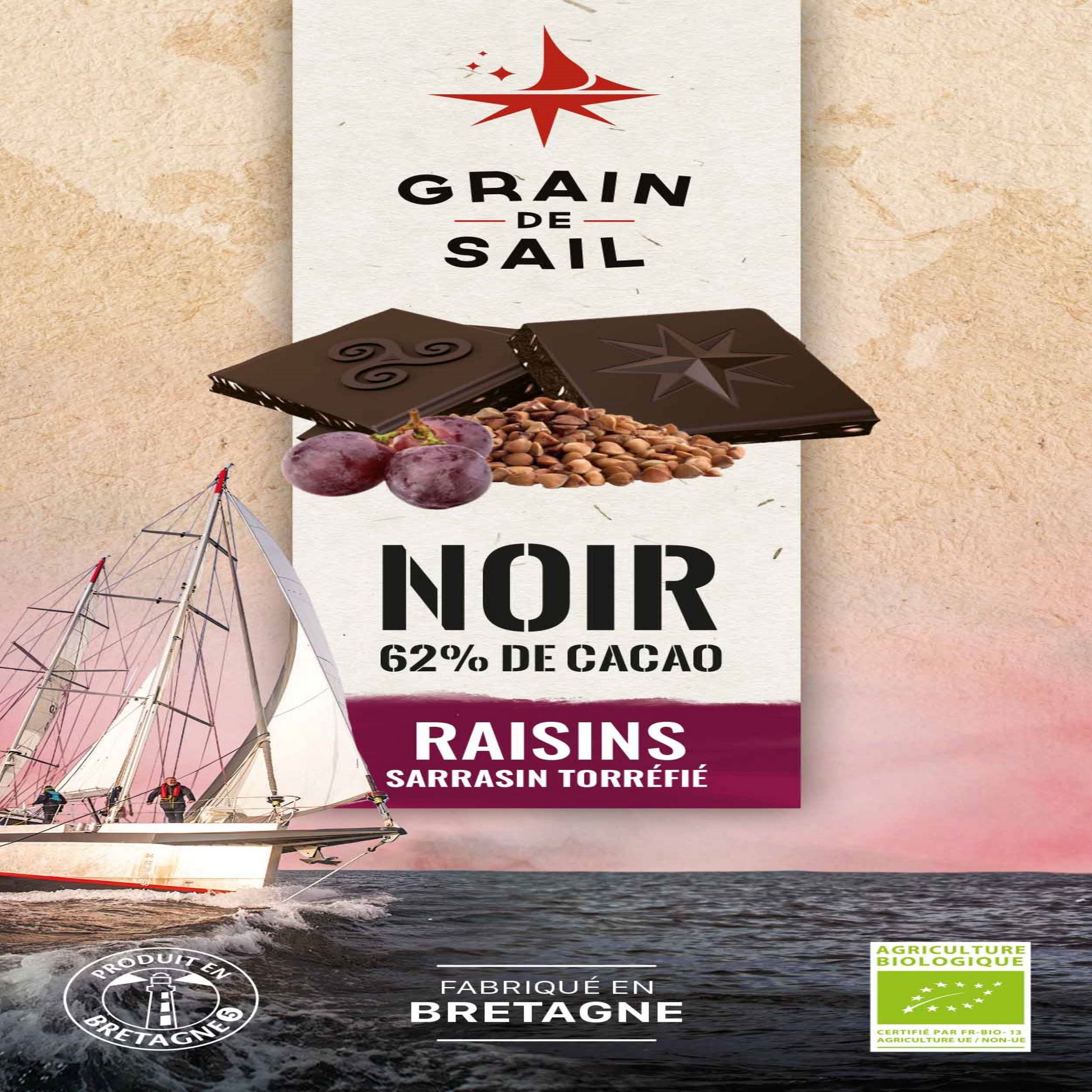 Tablette de chocolat noir 62% de cacao avec inclusions de raisins sultanine et sarrasin torréfié - 100gr - FR BIO 13 - Grain de Sail