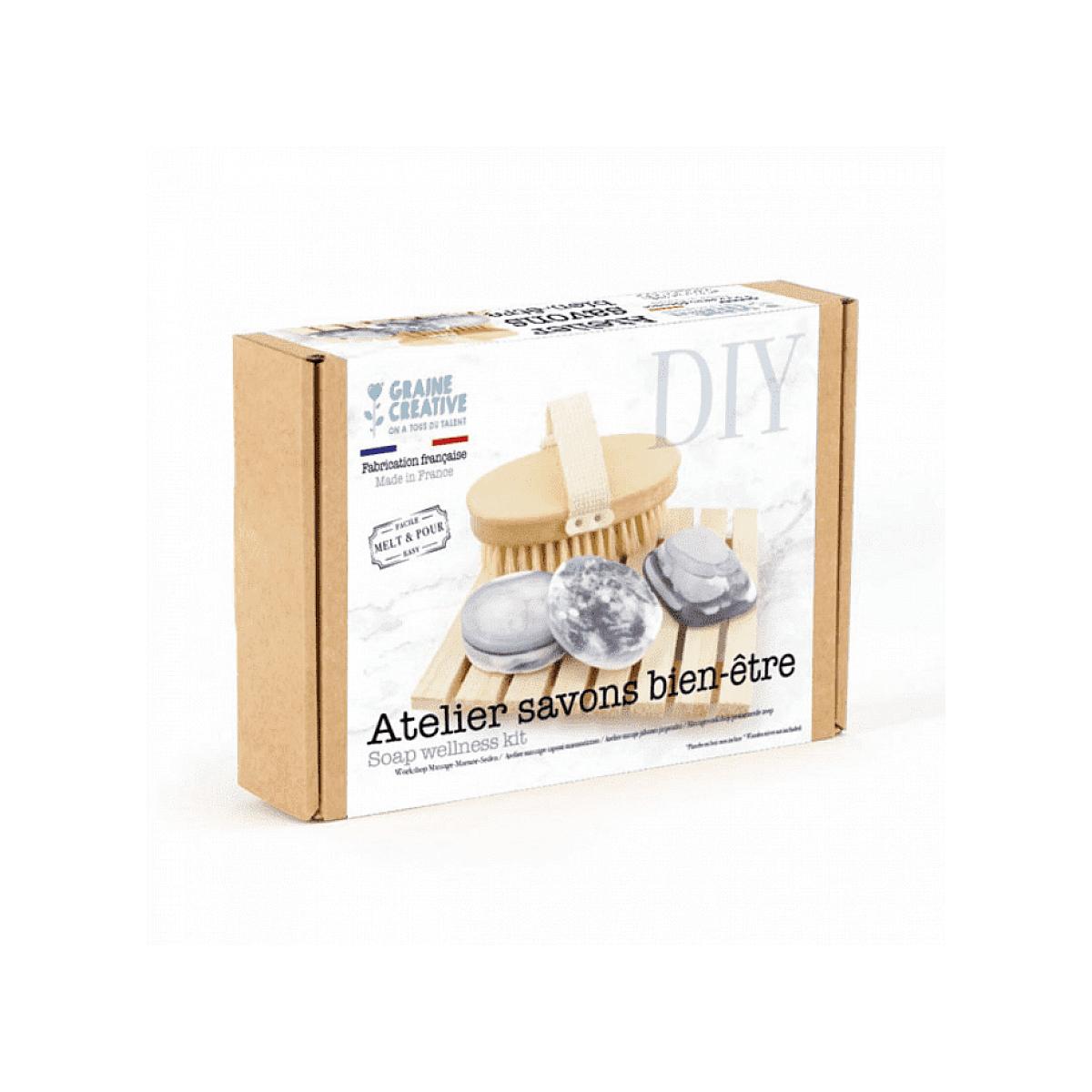 Moulez des savons pour un rendu original ! Vous pourrez les utiliser pour masser avec la brosse ! Le kit contient un moule savon (forme rond et rectangle), des pains de savon (blanc 100 g, gris 100 g, gris translucide 100 g) et une brosse de massage en bois (13 x 7,5 x 4 cm).