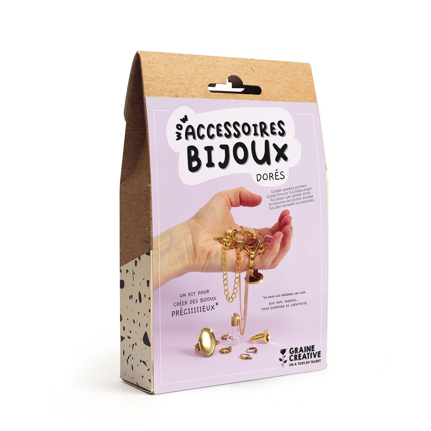 Réalisez vos propres bijoux avec cet assortiment d'accessoires pour bijoux dorés. 37 accessoires pour créer des bagues, bracelets, colliers, boucles d'oreilles... Contenu : 2 pendentifs fiole, 1 fil collier doré, 1 bracelet + fermoir, 16 mini crochets, 3 fermoirs magnétiques, 1 bague ronde creuse, 3 montures de bague picots, paire de crochets pour bo, bague ovale creuse, 4 fermoirs anneaux, 4 bélières. Une multitude de possibilités s'offre à vous ! Ajoutez des perles originales à vos créations : en bois, coquillages, argile, silicone, plastique ou même des perles Heishi. Découvrez aussi notre large collection de perles.