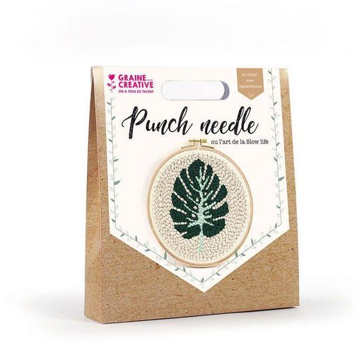 Coffret punch needle - Feuille tropicale - 20 cm Le punch needle est une technique de broderie en relief réalisé grâce à un poinçon. En piquant la toile, on obtient de petites boucles de laine qui forment un motif. Le kit punch needle feuille contient une aiguille, un tambour en forme de cercle Ø 20 cm, une toile, ainsi que 3 couleurs de laine. Prix de l'Innovation, catégorie 'Kit de l'année' du salon Creativeworld 2019.