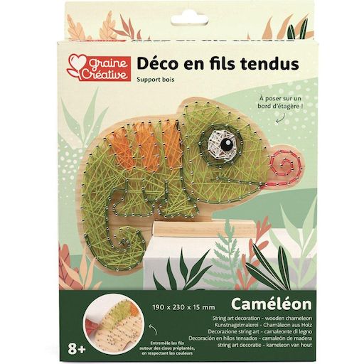 Petits artistes et créateurs inspirés ! Préparez-vous à tisser des merveilles avec le kit de Déco en Fils Tendus 'Caméléon' de Graine Créative ! C'est l'activité créative parfaite pour stimuler la concentration, la dextérité et la créativité, tout en réalisant un tableau en fil unique et coloré. Imaginez un peu : un kit de loisirs créatifs qui vous permet de créer une magnifique illustration de caméléon en utilisant du fil coloré et des clous ! Le set contient généralement une planche en bois pré-perforée avec le contour du caméléon, des clous, des bobines de fils de différentes couleurs vives, et des instructions détaillées. L'enfant pique les clous sur les points indiqués et tisse ensuite les fils autour des clous pour remplir le motif et créer un effet texturé et coloré