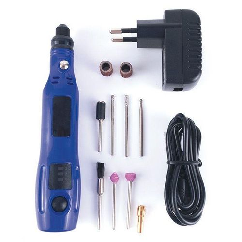Pratique, léger, ergonomique et pratique, ce graveur sur verre sans fil vous permettra de réaliser facilement de jolies gravures sur tous types d'objets en verre. Grâce à ses vitesses variables et ses 10 accessoires pour graver, affûter et fraiser le verre, ce graveur électrique offre de multiples possibilités de personnalisation ainsi qu'un travail de grande précision. Graveur sur verre électrique sans fil, 3 vitesses. 10 embouts (fraises diamantées, meules...). Vendu sous blister