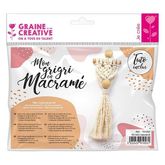 Mini Macramé. Avec ce mini kit, réalisez un macramé vous-même, pas à pas. Ce kit décoratif comprend 2 perles en bois brut Ø 2 cm, 1 fil de coton d'une longueur 6,25 m et Ø 2,5 mm et un petit bâtonnet de 8 cm et Ø 1,2 cm. Tuto illustré inclus.