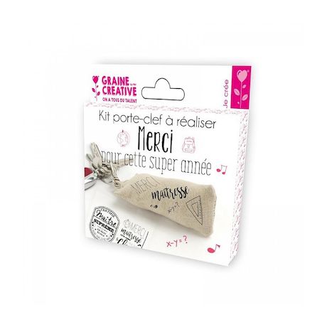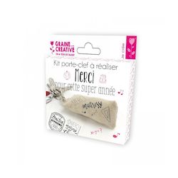 Kit comprenant tout le nécessaire pour réaliser un porte-clef pour remercier son maître ou sa maîtresse! Ce kit contient: 1 coupon de tissu 13 cm x 18 cm environ de couleur lin 1 planche de transferts thermocollants de la ouate 1 aiguille 1 mousqueton 8 mètres de fil mode d'emploi