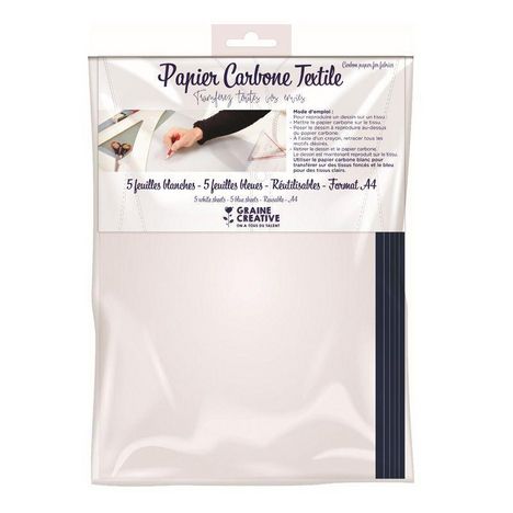 Grâce au papier carbone, transférez vos créations sur des tissus. Il suffit de poser le papier carbone sur le tissu souhaité. Posez le dessin à reproduire au-dessus du papier carbone. A l'aide d'un crayon, retracez tous les motifs désirés. Retirez le dessin et le papier carbone. Et voilà le tour est joué ! Taille A4. Contient 5 feuilles blanches et 5 feuilles bleues réutilisables. Utilisez le papier carbone blanc pour transférer sur des tissus foncés et le bleu pour des tissus clairs.