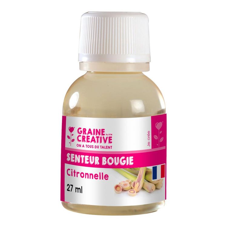 Parfum à bougie 27 ml citronnelle Donnez un arôme délicat et subtil à vos bougies, avec ce parfum à bougie citronnelle. Faites vos bougies vous-même avec un moule, de la cire à bougie, un colorant et tous les accessoires disponibles sur la boutique. Mode d'emploi : Verser le parfum citronnelle au dernier moment avant de couler votre mélange dans le moule pour éviter que le parfum ne s'évapore. Mélanger 2% de parfum citronnelle dans votre bougie fondue, ou plus selon votre souhait. Ne jamais surchauffer. Fabriqué en France