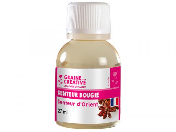 Parfum à bougie 27 ml Senteur d'orient. Donnez un arôme délicat et subtil à vos bougies, avec ce parfum à bougie senteur d'orient. Faites vos bougies vous-même avec un moule, de la cire à bougie, un colorant et tous les accessoires disponibles sur la boutique. Mode d'emploi : Verser le parfum senteur d'orient au dernier moment avant de couler votre mélange dans le moule pour éviter que le parfum ne s'évapore. Mélanger 2% de parfum senteur d'orient dans votre bougie fondue, ou plus selon votre souhait. Ne jamais surchauffer. Fabriqué en France