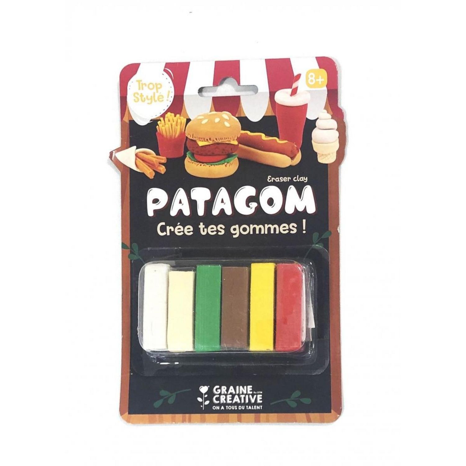 Découvrez la pâte à modeler Patagom inspirée de la junk food, parfaite pour les jeunes créateurs. Avec ses six pains de 25 g aux couleurs vives et miscibles, laissez libre cours à votre imagination pour façonner des gommes uniques. Modelez la pâte selon vos envies, enfournez-la à 120°C pendant 15 mi