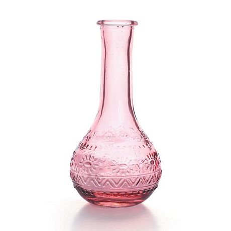 Ce vase teinté rose au look rétro est parfait pour apporter une touche brocante à votre décoration. La forme élégante du modèle Amsterdam réhaussera avec subtilité votre intérieur. Garnissez-le d'un bouquet de fleurs séchées, des Lagurus ou des herbes de Palma par exemple, et laissez le charme s'opérer. Ses motifs délicats en relief lui apportent la note de fantaisie délicate qui fera la différence ! En carafe, il fera également son petit effet lors d'un repas au soleil. Dimensions produit : 15,8 x 7,5 x 7,5 cm.