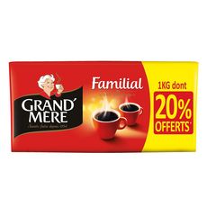 Format 1kg dont 20% offerts. La recette traditionnelle du café Grand Mère. Un café corsé au goût généreux, issu de grains Robusta. Démarrez la journée du bon pied avec le café moulu Grand Mère Familial.