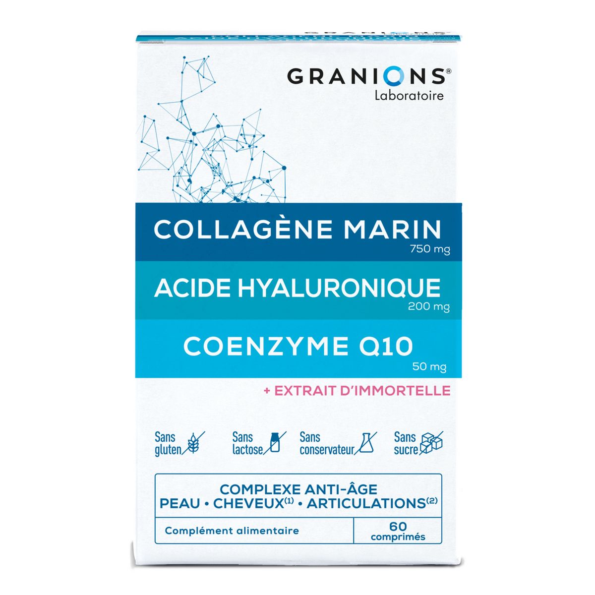 Le Laboratoire des Granions a développé une formule unique à base d’actifs incontournables au bien-être de l’organisme, aux vertus anti-âge et pour maintenir les tissus conjonctifs :