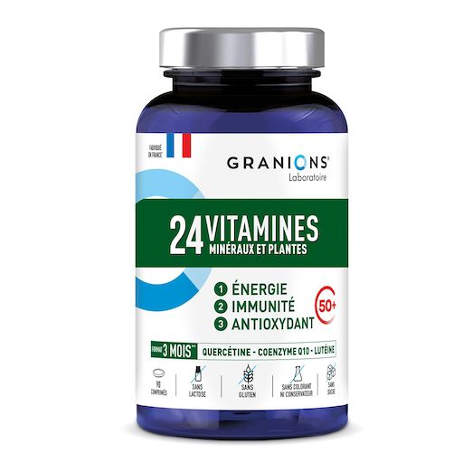 Le 24 vitamines, minéraux et plantes 50+ apporte tous les nutriments nécessaires dont du Coenzyme Q10 et de la Quercétine, et permet une assimilation facilitée par l’extrait de Poivre noir.