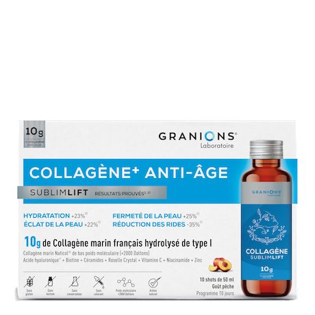 Les shots Collagène SublimLift de Granions ont été élaborés avec une formule unique basée sur des actifs synergiques scientifiquement étudiés pour leur efficacité. Ces shots visent à améliorer l'hydratation, la fermeté, l'élasticité et la réduction des rides de la peau.