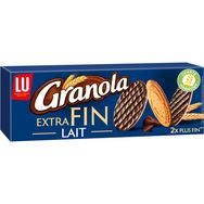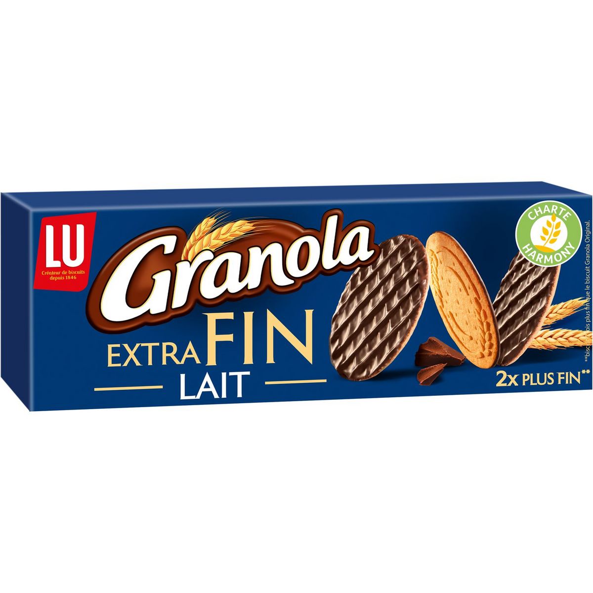 Biscuits sablés nappés de chocolat au lait (38%). Granola Extra Fin, un biscuit tout en finesse avec la texture et le goût unique du chocolat Granola !