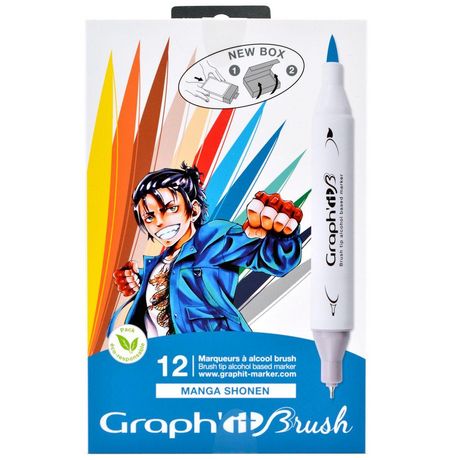 Coffret de 12 marqueurs à alcool Manga. Le set de 12 marqueurs Graph'It Shonen a été élaboré afin de vous offrir l 'essentiel des couleurs altiques dont vous avez besoin pour créer une multitude de dessins dans le thème Manga. Les couleurs sont indiquées sur les feutres afin de vous repérer plus facilement la couleur dont vous avez besoin. Le feutre est composé d'une pointe large et biseauté de 1 à 7 mm et d'une autre plus fine (0,8 mm) et conique qui vous permettra de dessiner des détails et autres traits fins. Le feutre est très facile à prendre en main grâce à sa forme triangulaire. L'encre sèche très vite et est superposable, mais aussi miscible grâce à un marqueur à un feutre blender. Réalisez des bandes dessinées, des mangas, du scrapbooking et autres activités grâce à ce coffret. Il s'utilise idéalement sur du papier épais ou layout. Le set contient 12 feutres.
