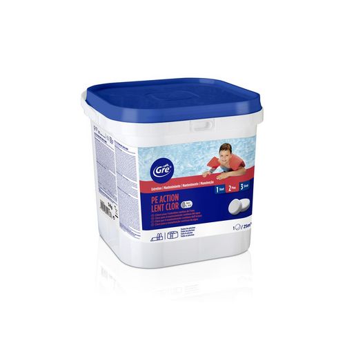 Traitement d'entretien: avec le pH de l'eau ajusté mettre dans les paniers des skimmers un compact de chlore lent pour chaque 30 m³ d'eau tous les 7/10 jours. Ces doses sont données à titre indicatif et peuvent être modifiées en fonction des caractéristiques propres à chaque piscine climat etc.