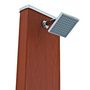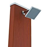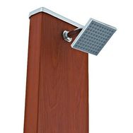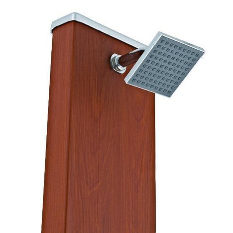 Douche solaire ronde 32L, en aluminium, aspect bois, avec robinet et lave-pieds.