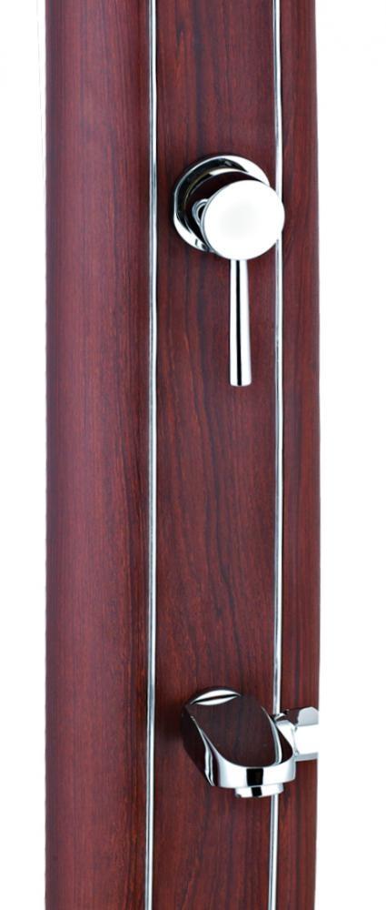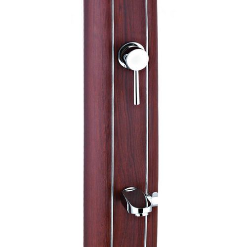 Douche solaire carrée 32L, en aluminium, aspect bois, avec robinet et lave-pieds.