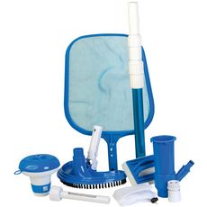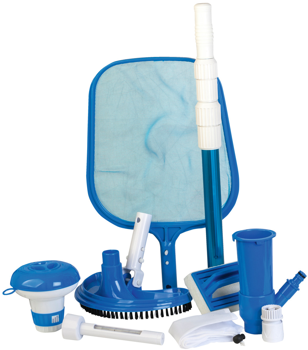 Ce kit d'entretien est idéal pour votre piscine. Il comprend 6 accessoires : un manche télescopique de 120cm, 1 brosse ligne d'eau, 1 épuisette pour nettoyer la surface, 1 thermomètre flottant, 1tête de balai demi-lune + effet venturi + 1 sac, 1 diffuseur de chlore avec un diamètre de 12cm
