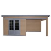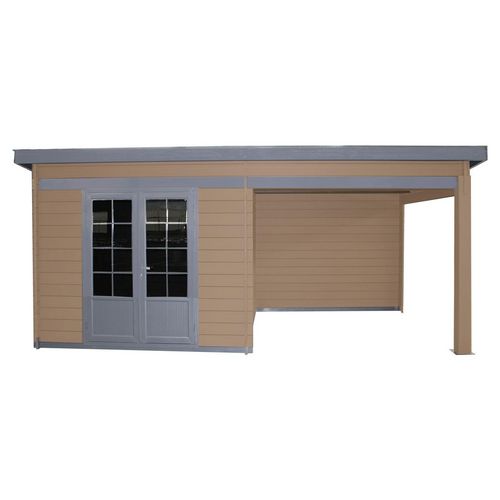 "Abri de jardin moderne, avec un grand espace sous auvent: idéal pour installer un salon détente, une cuisine d'été etc… La très grande hauteur permet de profiter pleinement en evitant la sensation d'écrasement.