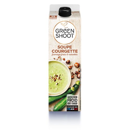 Ingrédients : Eau de source, courgette 22,7%, brocoli, fromage (lait écrémé, babeurre, crème, sel, babeurre déshydraté, protéines laitières, ferments lactiques), oignons, parmesan 2,7% (lait de vache, sel, présure de veau), noisettes torréfiées 1,5%, sel de Guérande, huile d'olive vierge extra.
