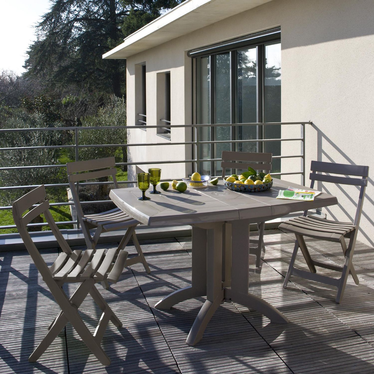 Ce salon repas de jardin est composé de la table de jardin 4 personnes VEGA en résine de coloris taupe. Et 4 chaises de jardin en résine de coloris taupe. La table et les chaises sont pliantes. Ce qui vous permettra de ranger votre salon de jardin facilement, et de le remettre en place pour profiter d'un moment de détente dans votre jardin ou sur votre terrasse facilement.