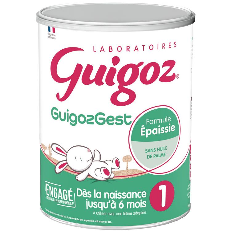Pourquoi GuigozGest 1 ? Les Laboratoires Guigoz ont développé GuigozGest 1, une formule épaissie* qui convient à l'alimentation particulière du nourrisson dès la naissance quand il n'est pas allaité et jusqu'à 6 mois**. Parlez-en à votre médecin.*A utiliser avec une tétine adaptée.** conformément à la règlementation des laits pour nourrissons.