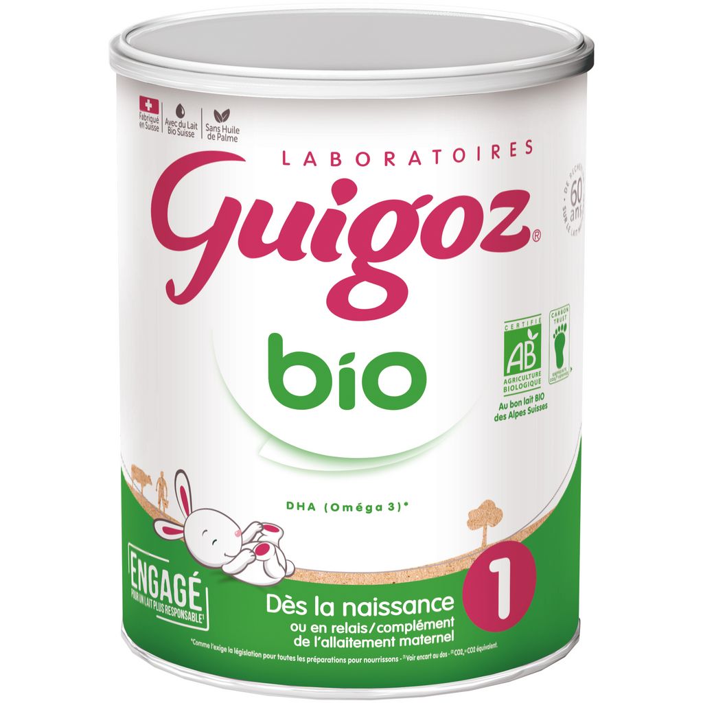 Pourquoi GUIGOZ® Bio 1 ?Inspirés par plus de 60 ans de recherche sur le lait maternel, les Laboratoires Guigoz ont développé GUIGOZ Bio 1 : Une formule qui répond aux besoins spécifiques de votre bébé*, dès la naissance et jusqu' 6 mois, ou en relais / complément de l'allaitement maternel quand il n'est pas allaité . Engagé dans une démarche plus responsable pour contribuer à un meilleur avenir. Avec des ingrédients agricoles issus de l'Agriculture Biologique, et un lait BIO** des Alpes Suisses, provenant de vaches principalement élevées en plein air, nourries de pâturages et fourrages selon les règles strictes de l'Agriculture Biologique.* Conformément à la réglementation des laits pour nourrissons.**Conformément à la réglementation sur l'Agriculture Biologique . Encart CARBON TRUST Les émissions de carbone de ce produit ont diminué depuis 2019. Vérification menée tous les deux ans conformément à la norme ISO 14067. Pour en savoir plus, rendez-vous sur www.guigoz.fr carbontrust.com/label.