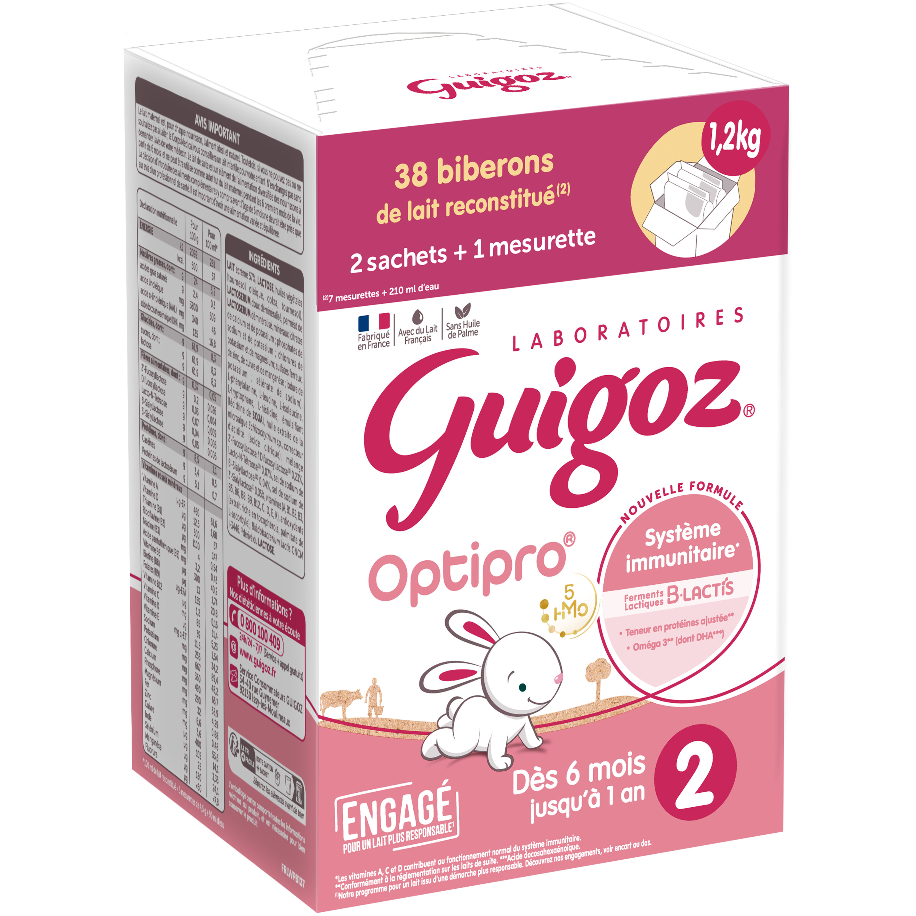 Pourquoi GUIGOZ® Optipro® 2 convient à bébé ? Inspirés par 60 ans de recherche, les Laboratoires Guigoz continuent d'innover et ont développé une nouvelle formule, pour toujours satisfaire les besoins nutritionnels spécifiques de votre bébé entre 6 mois et 1 an*, dans le cadre d'une alimentation diversifiée. Cette formule contient :*Conformément à la réglementation sur les laits de suite. 5 des principaux oligosaccharides présents dans le lait maternel**. Teneur en protéines ajustée*. Bifidobactéries B.lactis. Des Vitamines A*, C* et D*, qui contribuent au fonctionnement normal du système immunitaire. De L'iode* qui contribue au développement cognitif normal. Du DHA* (acide docosahexaénoïque) et de l'AAL* (acide alpha-linolénique) deux acides gras essentiels de la famille des Oméga 3. Le DHA contribue au développement normal de la vue des nourrissons***, et l'AAL participe au développement normal du cerveau.*Conformément à la réglementation sur les laits de suite.**Non issus du lait maternel.***Pour un apport quotidien de 100mg.