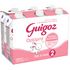 Quantités recommandées : 3x230 ml de Guigoz dès 6 mois par jour. Les quantités de lait de suite sont données à titre indicatif. Le volume et le nombre de biberons sont à ajuster par les professionnels de santé aux besoins de chaque enfant. A partir de 6 mois, l'alimentation de votre bébé se diversifie (céréales, fruits, légumes). Consultez votre médecin pour toute information supplémentaire. Préparez le biberon juste avant le repas. Agitez bien la brique avant de l'ouvrir. Ne pas ajouter d'eau. Ce produit peut être consommé à température ambiante ou tiède (max 40°C). Pour servir tiède, nous vous déconseillons l'emploi du four à micro-ondes en raison du risque de brûlures. Préférez le bain-marie ou le chauffe-biberon. Ne pas faire bouillir. Agitez et contrôlez la température sur la face interne de votre avant-bras. Le biberon doit être consommé dans l'heure qui suit sa préparation. Jetez sans hésiter les restes d'un biberon non terminé.