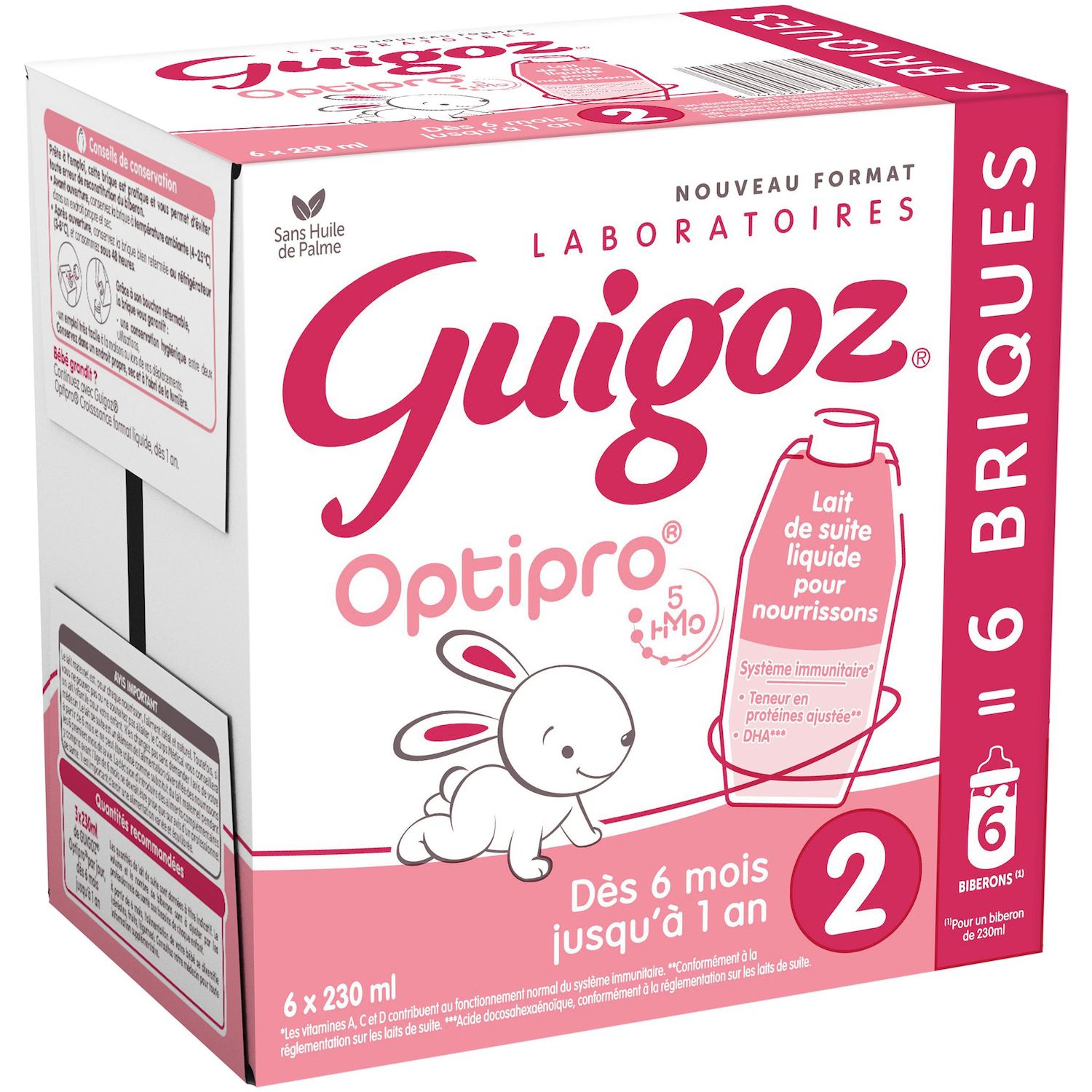 Inspirés par 60 ans de recherche sur le lait maternel, les Laboratoires GUIGOZ ont développé GUIGOZ® Optipro® 2 (logo 5HMO) liquide, formulé avec 5 des principaux oligosaccharides présents dans le lait maternel (2'-Fucosyllactose, Difucosyllactose, Lacto-N-Tétraose, 6'-Sialyllactose et 3'-Sialyllactose), une teneur en protéines ajustée* et une association de vitamines et minéraux pour répondre aux besoins nutritionnels* de votre bébé dès 6 mois jusqu'à 1 an, dans le cadre d'une alimentation diversifiée. non issus du lait maternel.*Conformément à la réglementation sur les laits de suite.
