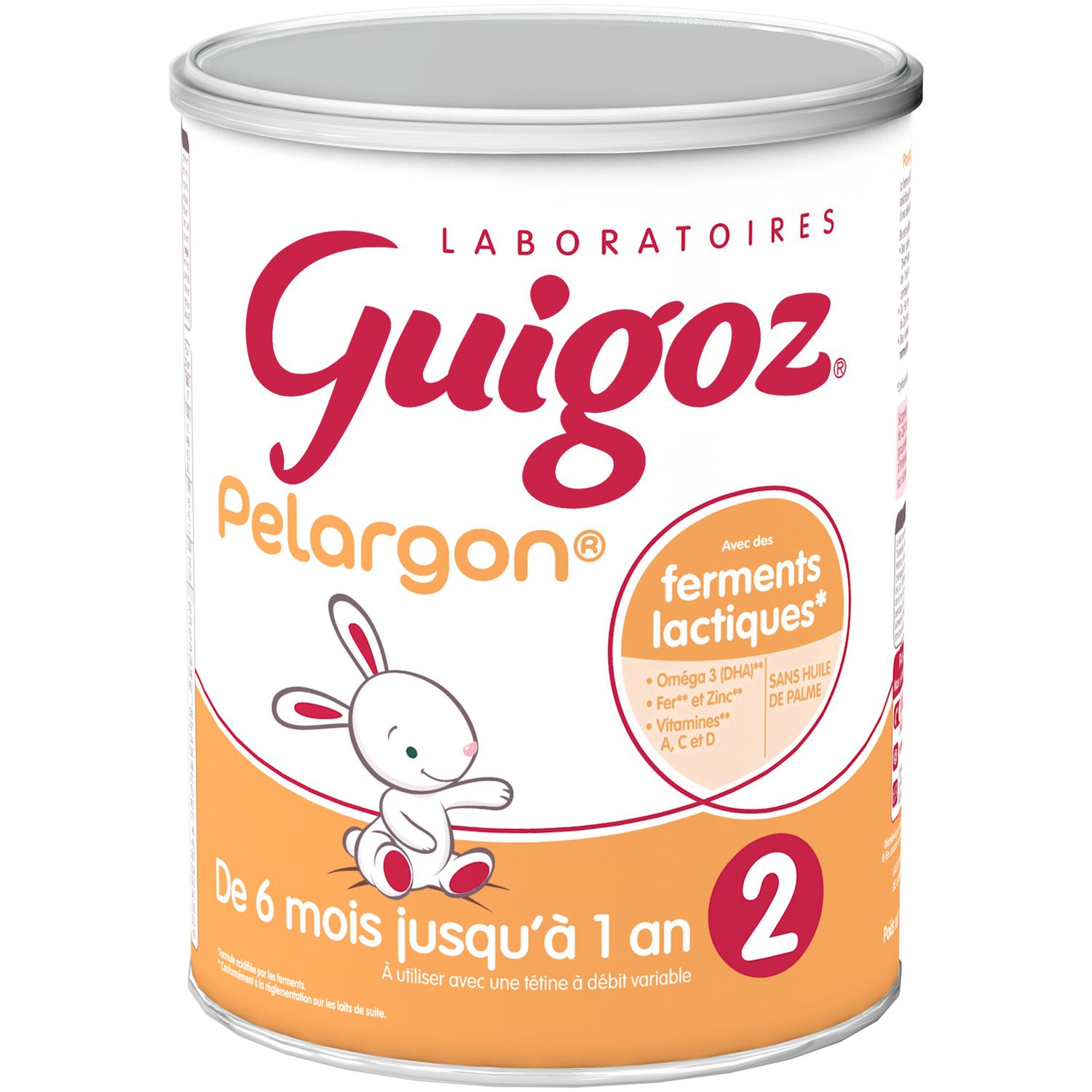 Pourquoi GUIGOZ® Pelargon 2 ? La formule GUIGOZ® PELARGON 2 répond aux besoins nutritionnels spécifiques de votre bébé dès 6 mois et jusqu'à 1 an, dans le cadre d'une alimentation diversifiée*. Elle est acidifiée avec des ferments lactiques et contient : Des acides gras essentiels de la famille des Oméga 3, dont le DHA* (acide docosahexaénoïque), un acide gras polyinsaturé issu de l'huile de poisson et l'acide alpha-linolénique (AAL)*, qui contribue au développement normal du tissu cérébral et nerveux. Du Fer* qui contribue au développement cognitif normal, et du Zinc* pour une croissance normale. Des vitamines A*, C* et D* qui contribuent au fonctionnement normal du système immunitaire.*Conformément à la réglementation sur les laits de suite. Parlez en à votre medecin.