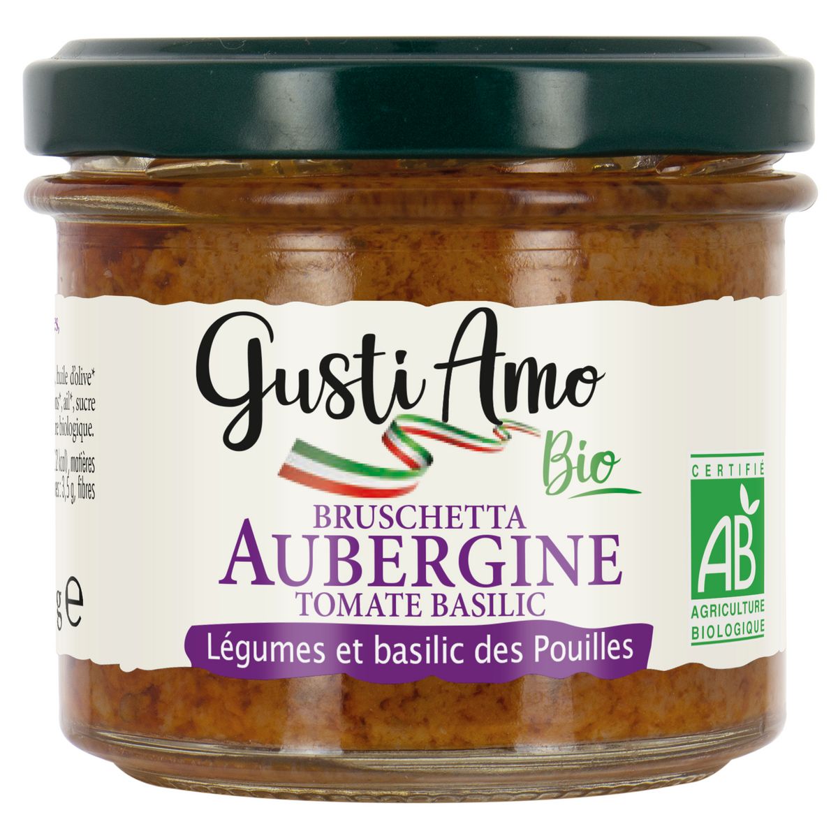 Spécialité à tartiner à base d'aubergines, de tomates séchées et de basilic bio.