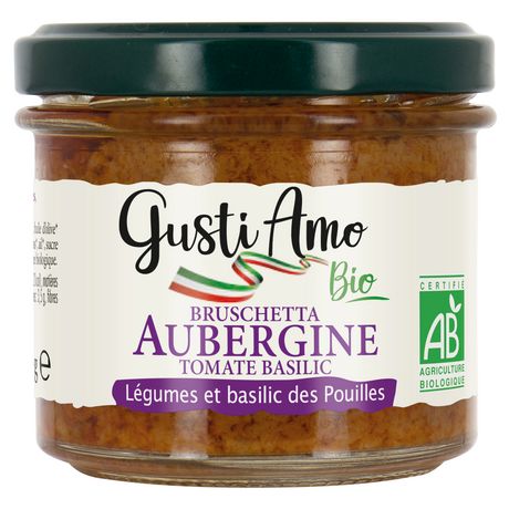 Les tartinables Bruschetta sont cuisinées simplement avec de bons légumes bio d'Italie, de l'huile d'olive et des aromates. Cuisiné en Italie Aubergine origine Pouilles Tomate séchée au soleil BIO