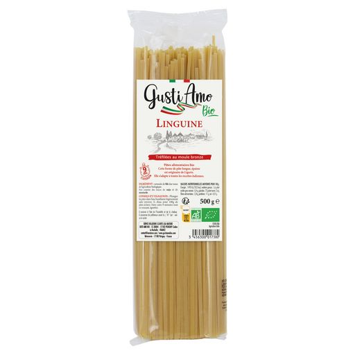 Les Linguine sont originaires de la région italienne de Ligurie, ces pâtes longues tréfilées au moule bronze, sont un peu rugueuses et se marient avec toutes les sauces traditionnelles italiennes. Tréfilées au moule bronze Fabriquées en Italie Blé italien BIO