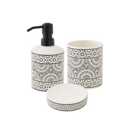 Set de salle de bains blanc avec motifs ethniques - TRIBU - LEVASSEURCe set de salle de bain en porcelaine blanc, fait partie de la gamme TRIBU. Il contient un distributeur de savon, un porte savon et un porte brosse à dent.Cette gamme est conçue pour transformer vos accessoires de salle de bains en