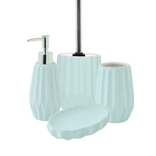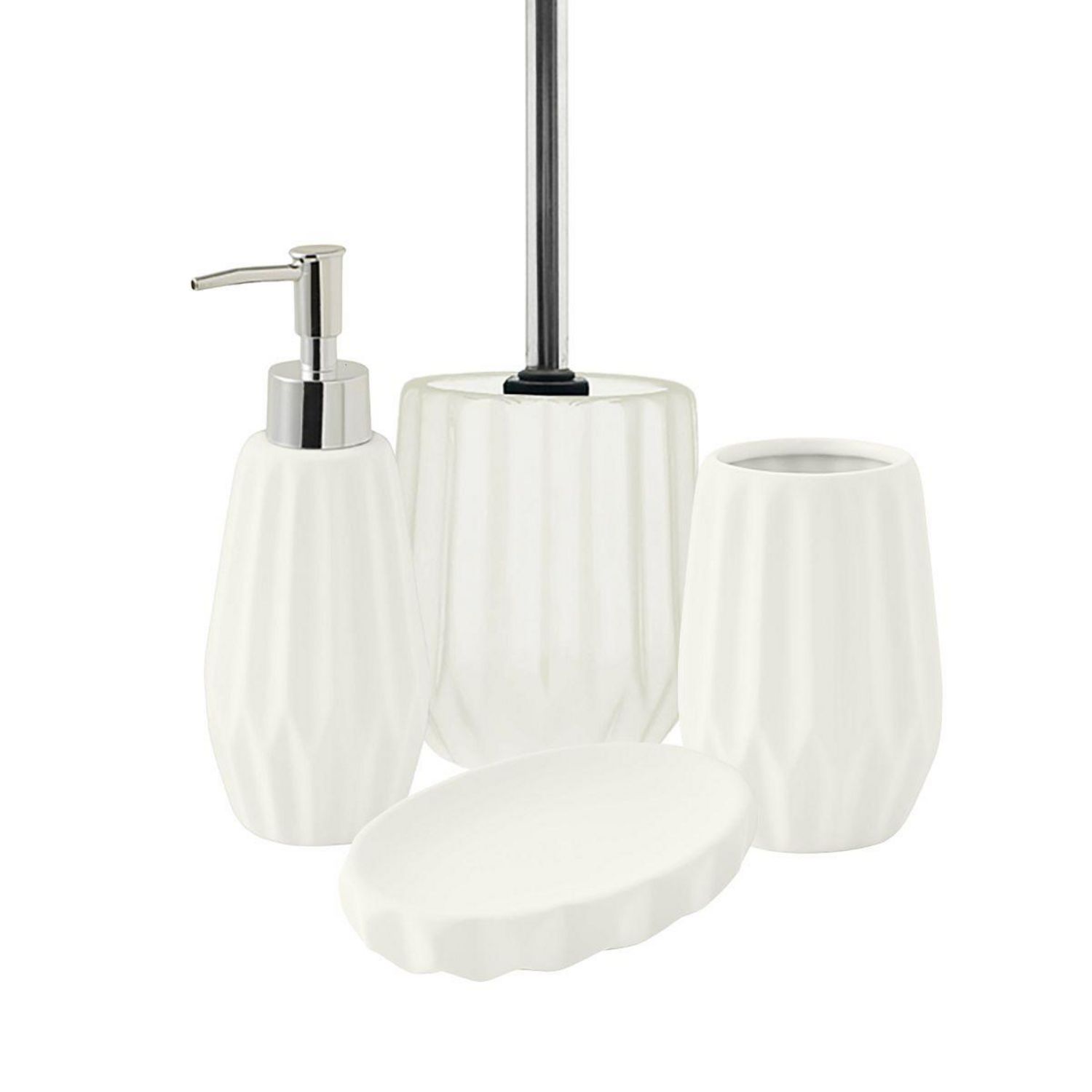 Ce set de salle de bain en céramique, fait partie de la gamme FACETTE. Il contient un distributeur de savon, un porte savon, un porte brosse à dent et une brosse WC.