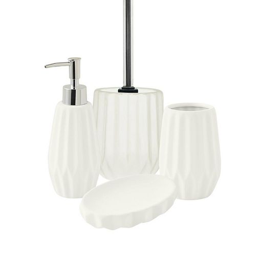 Set de salle de bain - FACETTE - LEVASSEURCe set de salle de bain en céramique, fait partie de la gamme FACETTE. Il contient un distributeur de savon, un porte savon, un porte brosse à dent et une brosse WC.Cette gamme est conçue pour transformer vos accessoires de salle de bains en objet de décora